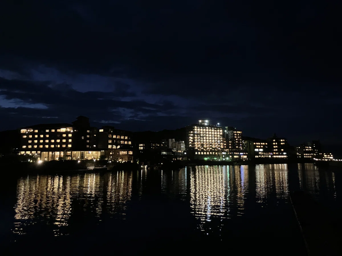 水面に反射する夜景も美しい温泉街