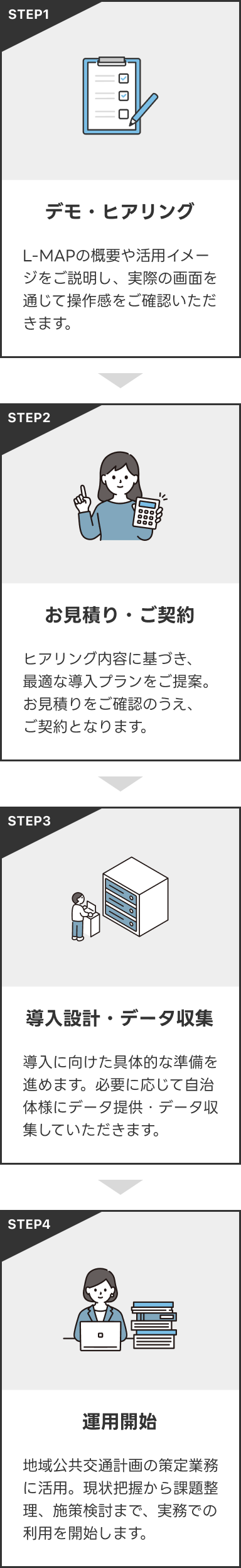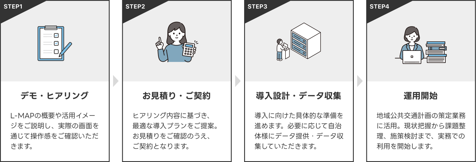 L-MAPでは指標の継続的な更新や施策の効果検証が可能で、PDCAサイクルを回しながら交通施策の改善につなげることができます。必要に応じて運用支援や活用方法のサポートも提供しています。