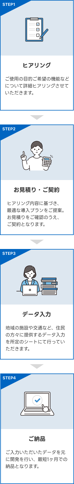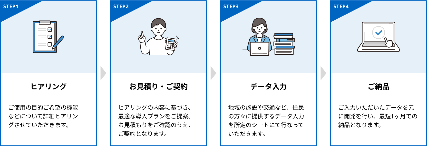 導入いただく自治体様・事業者様により掲載する情報を収集のうえ、ご自身でシステムに入力(更新)していただきます。